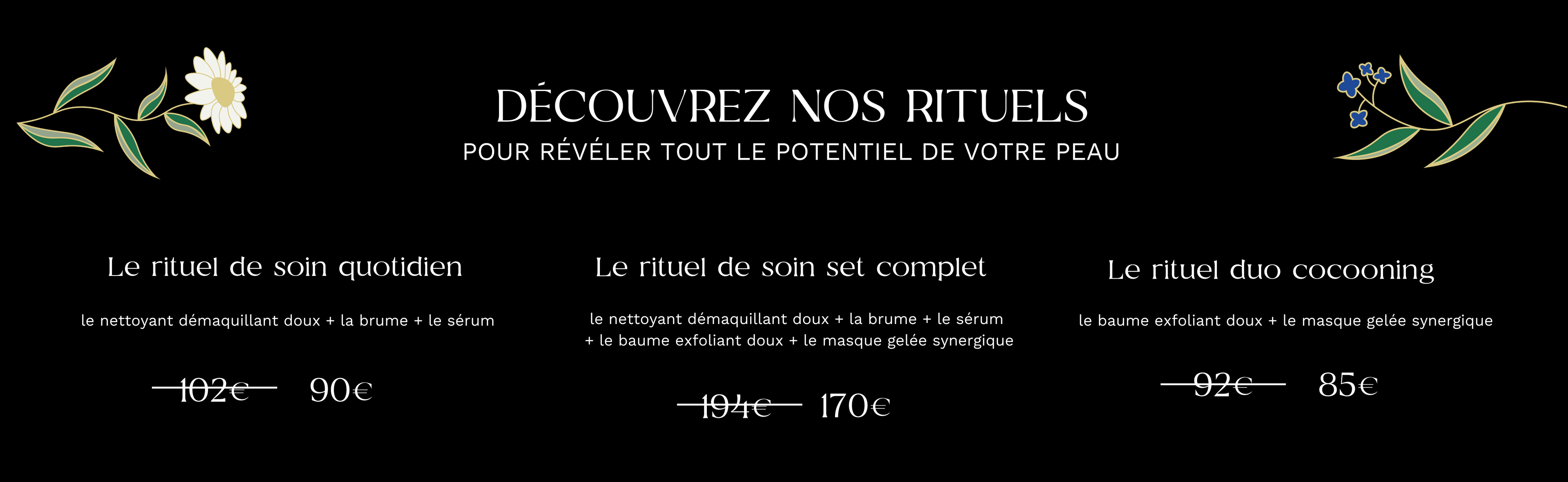 Notre peau a été habituée à l’utilisation de cosmétiques conventionnels qui la rendent dépendante et l’empêchent d’assurer ses fonctions. En passant à des soins naturels, la peau retrouve son équilibre et sa capacité à s’auto-régénérer. Elle devient plus forte, plus saine et pleine de vitalité. Découvrez nos rituels de soin, composés de molécules naturellement présentes dans l’organisme et nécessaires au bon fonctionnement de la peau.